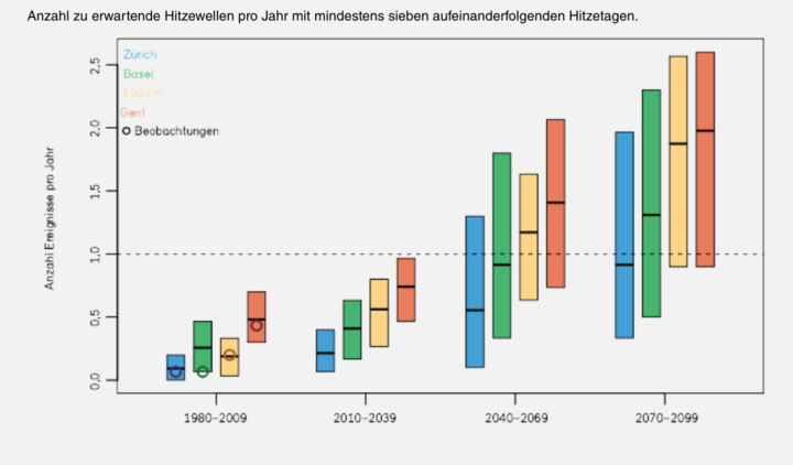 Aufgrund des Klimawandels werden in der Schweiz Hitzewellen künftig häufiger, intensiver und länger andauern. Am höchsten ist die Hitzebelastung jeweils in den bevölkerungsreichen städtischen Gebieten, wo versiegelte Flächen zu einem Hitzeinseleffekt führen. In tiefer gelegenen Regionen wie dem Mittelland, dem Tessin und den tiefen Alpentälern rechnet das National Centre for Climate Services NCCS mit einem deutlichen Anstieg von sehr heissen Tagen sowie von Tropennächten, in denen die Temperatur nicht unter 20 Grad Celsius fällt.